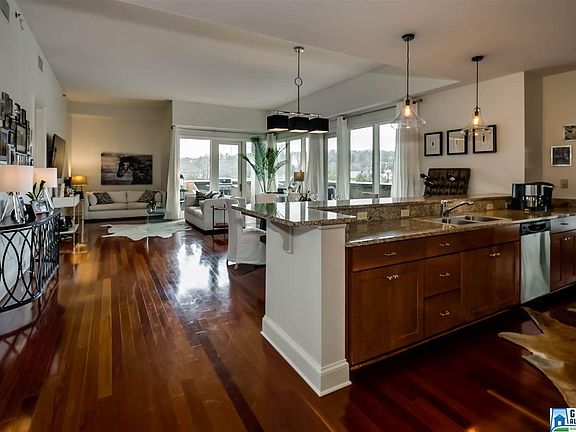 Beautiful second-floor, corner unit with views of Vulcan! This unit features an open floor plan with a spacious living and dining area overlooking the large patio and view of Homewood. The kitchen includes a large breakfast bar, beautiful cabinetry with abundant storage space, stainless steel appliances, and a pantry. This rare opportunity for a corner unit allows for a wrap-around balcony with plenty of space for a grill and furniture. Inside, the master suite boasts a beautiful bathroom with a large tub and separate shower. The three bedroom layout makes it easy to utilize space for an office or guest room, and the second full bath includes two sinks and a tub/shower combo. This unit has been well-maintained, offers plenty of space, and is zoned for Homewood Schools. Great location in the heart of Downtown Homewood and convenient to restaurants, shops, and more.