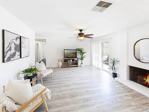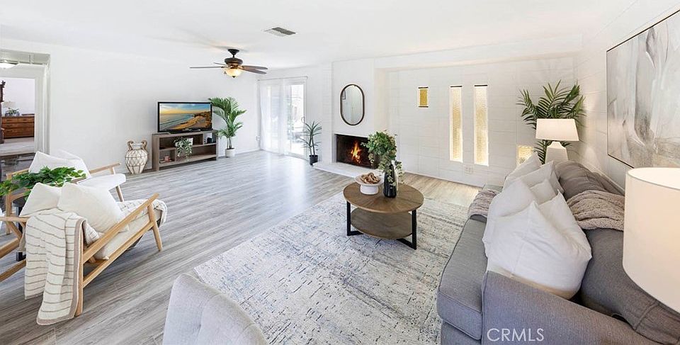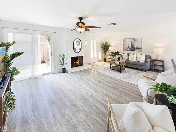 Enjoy North Tustin style living for less! This charming single-level condo offers 2 bedrooms, 2 bathrooms, and approximately 1,283 sq. ft. of beautifully updated living space—all with no steps at the entry or inside the home. Located in the highly sought-after Hewes Middle School and Foothill High School district, this home has no one above or below for added privacy. Designed with a mid-century modern vibe, the home is filled with natural light from walls of windows and sliding doors that create a bright, airy feel throughout. Inside, you’ll find thoughtful upgrades throughout. The kitchen was fully remodeled in 2012 with granite countertops, custom cabinetry, and modern appliances. An LG refrigerator (2024) is included with the home, along with a stackable washer and dryer conveniently located in the kitchen. Additional kitchen upgrades include a new exhaust fan (2020) and disposal (2024). The guest bath vanity and granite countertop were updated in 2018, while the primary bathroom was remodeled in 2019 by a licensed contractor, featuring a whirlpool tub, new plumbing, tile work, window, and exhaust fan. Electrical updates include a dedicated 220 VAC line for the tub. Additional highlights include: New laminate flooring installed August 2025 (professionally leveled, measured, and moisture-tested). Gorgeous marble flooring in kitchen and hallway. AC unit replaced in 2022 (with 5-year manufacturer warranty. Smart programmable thermostat (2022). Cozy gas and wood-burning fireplace. Garage door opener installed in 2012. Small HOA of only 4 homes. Enjoy the private backyard, perfect for outdoor dining or barbecues, with direct access to the two-car garage. A one-of-a-kind single-story condo with yard and two-car garage!