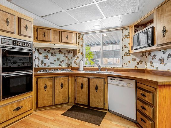 Spacious home situated on a large, landscaped corner lot! Separate living/family rooms. Recently updated guest bathroom with new walk-in tile shower, vanity and fixtures. Updated laminate flooring in the primary & guest bathrooms as well as the indoor laundry room. Brand new carpet recently installed throughout main living areas and both bedrooms. 2 storage sheds included. Home was recently painted on the exterior. Park ammenities include Club house with kitchen, library with sunken fireplace/sitting area, Pool table room, shuffle board hall, enclosed hot tub area and outdoor pool. Seller will provide a clear Section 1&2 prior to close of escrow.