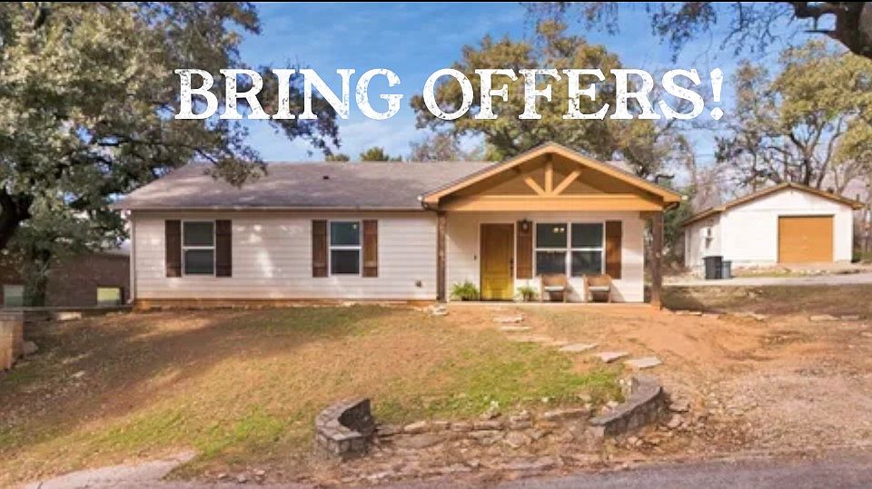 BRING OFFERS! Home nestled in the trees, 5 minutes from downtown Granbury, you'll live by everything Granbury has to offer in a country like setting, and pay no city taxes. This cottage like home features front & back covered porches, a double lot, and a detached workshop with parking. Inside you'll find a peaceful living area defined by a hip vault and drop ceiling fan, exceptional wood-look stained concrete floors that have proven to be very durable, stain grade wooden cabinets, a full size pantry, and a separate full size laundry room. Full encapsulation spray foam home insulation. Summertime electric bills average around $200, with the AC set at a chilly 67 degrees! Western Hills Harbor HOA provides community lake access for dues of less than $90 a year.