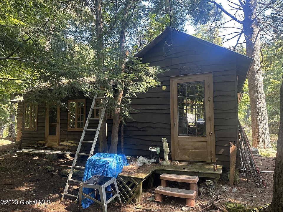 Cottage sits on .47 acres. Enjoy a private wooded setting overlooking a serene pond. Nearby marina's for boat launching, backs up to Buck Mountain trails for hiking, and walking distance to the Residents only Fort Ann Beach on Lake George. Additional structures include two sheds and outhouse. No well or septic on the property. Electric currently present but needs to be brought up to code. Desirable lot and location. Sold ''as is'' condition.
