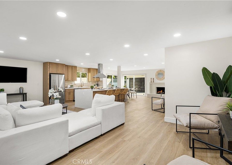 A remodeled home with lush green grass, sprinklers, new exterior paint, an updated solar system that is paid off, board & batten siding, front door, retrofit windows, sliders, luxury vinyl flooring, interior paint, open kitchen to the family room, quartz countertops, designer chef kitchen, stainless steel appliances, quartz fireplace, custom backsplash, AC splits, ceiling fans, interior paint, recessed lighting, primary suite, walk-in closet, two remodeled bathrooms, indoor washer & dryer hookups, 200 amp panel, tankless water heater, finished two car garage with new door, new exterior gate, backyard grass, landscaping and sprinklers. This remodel has been thoughtfully designed with a modern touch and a love for life.