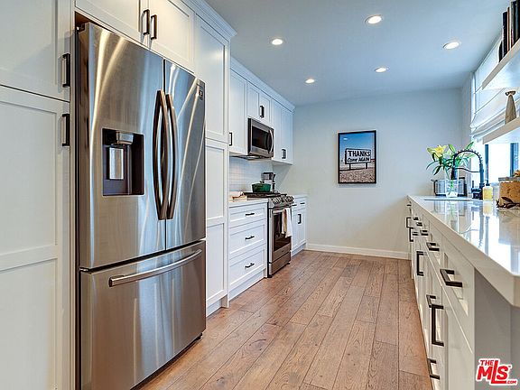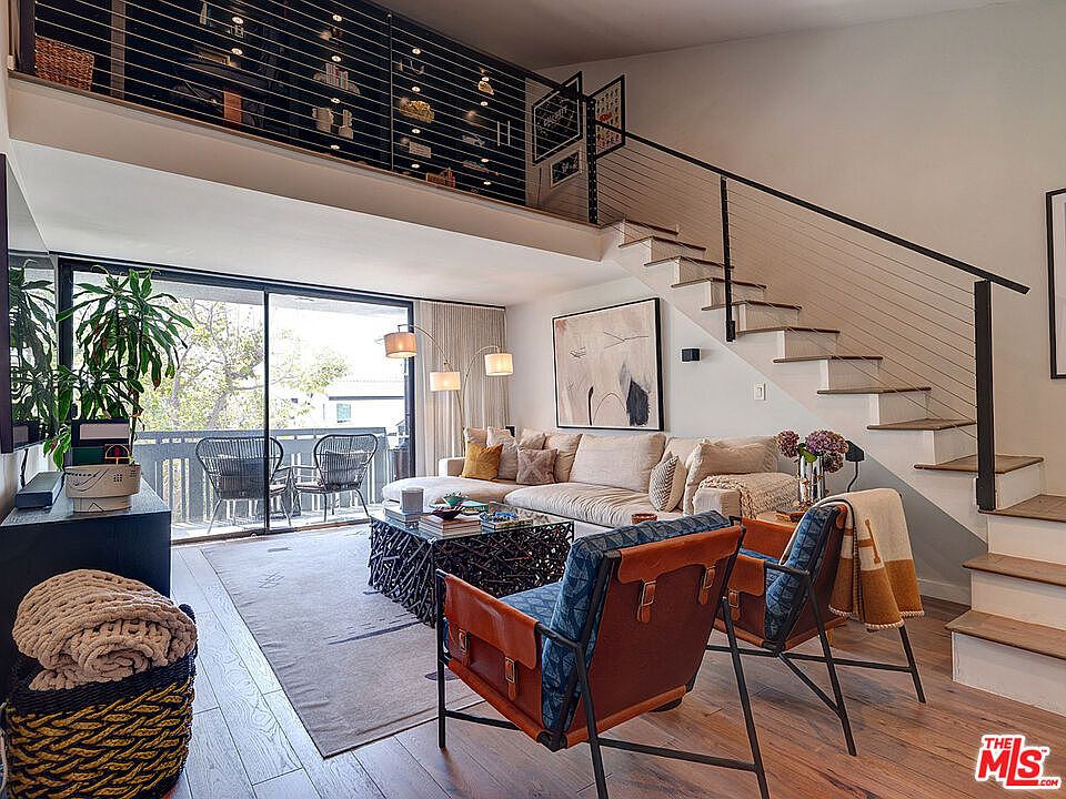 This stunning 3-bedroom, 3-bathroom condominium offers nearly 2,000 sq. ft. of beautifully remodeled living space in a top-floor, west-facing unit with an exceptional single-story layout and bonus loft. Every detail has been thoughtfully reimagined with a crisp, contemporary aesthetic. The spacious living room boasts 17-foot ceilings, a gas fireplace, and sliding glass doors opening to a private balcony with unforgettable sunset views. A bonus loft with custom built-in bookshelves provides the perfect setting for a home office, library, or creative retreat. The well-appointed kitchen features white quartz countertops, stainless steel appliances, shaker cabinetry, and open shelving, flowing seamlessly into the dining area. A convenient powder room off the dining space makes entertaining effortless. Three generous bedrooms include a luxurious primary suite with west-facing views, an expansive walk-in closet, and bonus storage space. A full hall bath serves the additional bedrooms, while white oak wood floors throughout add warmth and style. The home is complete with a full-size washer and dryer inside the unit for convenience. Additional features include three deeded parking spaces in a gated garage with EV charging and an immense amount of dedicated storage space. Building amenities include a rooftop deck with pool and spa, surrounded by panoramic views of Century City, Westwood, and beyond. Just minutes from the restaurants, shopping, and entertainment of Westfield Century City, this home is also located within the sought-after Westwood Charter Elementary School district.
