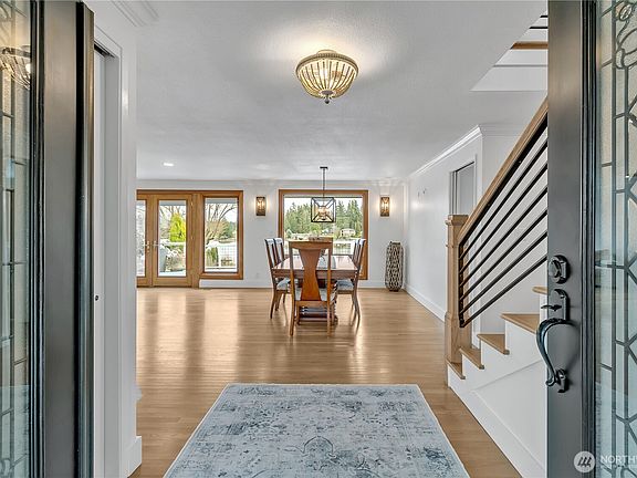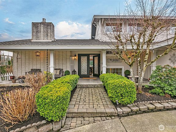 WATERFRONT! Huge opp. to own a Beautiful Setting, mostly updated 3300+ sqft home w/unobstructed view of lake & Mt Rainier. Step through the double doors into the main entry revealing an open dining & livingroom. The highend kitchen features a huge quartz island & huge kitchen window revealing stunning Lake and Mt views. Newly refinished gleaming hardwood floors run throughout most of the home. Primary bath includes heated floor. Pella windows&doors throughout. Main floor includes two cozy gas fireplaces. Additional highlights include AC, finished basement with two add'l rooms and redone 3/4 bath. Huge dry deck keeps gear dry. Manicured yard, nice sized dock with covered boat lift, RV/boat parking, dog kennel and more. Dont Miss this 1
