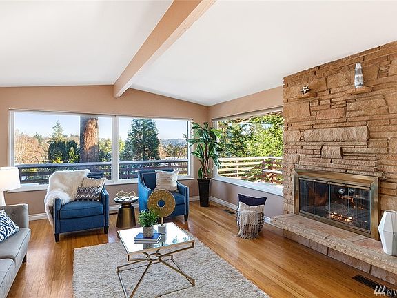 Rare opportunity to own a home in the Uplake community! Beautiful mid century mod home has oak floors, new carpet, vaulted ceilings with huge windows & two gas fireplaces! Enjoy stunning views of the Cascade Mountains and partial views of Lake Washington from your expansive deck. The Burke-Gilman Trail is blocks away and Lake Forest Park Shopping Center is in easy walking distance. Situated on a dead end street, location is private and woodsy, but with easy access to Bellevue and Seattle.