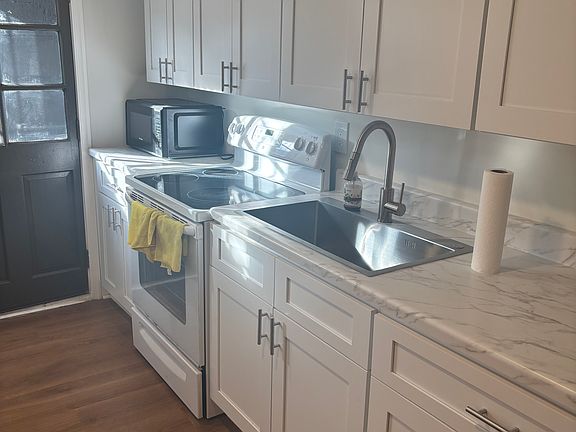 Modern Full Kitchen: Enjoy a brand-new kitchen equipped with white shaker cabinets, elegant marble-style countertops, a deep stainless steel sink, and a full suite of appliances (electric stove, refrigerator, and microwave).