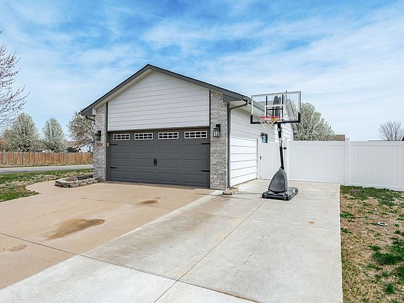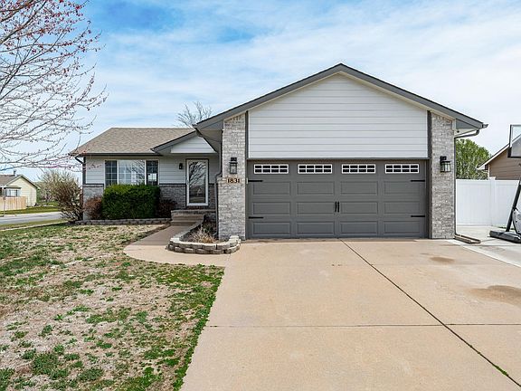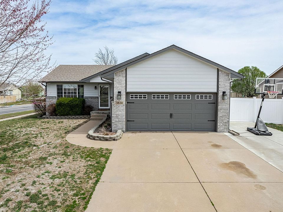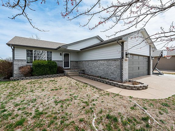 Lovely home in Goddard located on a corner lot. This home features 4 bedrooms, 3 bathrooms, vaulted ceilings, 2 car garage. Entering the home you will notice the open floor plan, lots of natural light, wood floors, and large rooms. The kitchen has a nice eating bar and newer granite counters. The master suite includes a private bathroom, and a walk in closet. There is an additional bedroom and bathroom on the main floor. The basement features a wet bar, family room with a wood burning fireplace and room for a game table. There is also two bedrooms and full bathroom in the basement. Roof and gutters are only 4-5 years old, new water heater, new HVAC June of 2022. Located in a great neighborhood with easy access to Hwy 54.