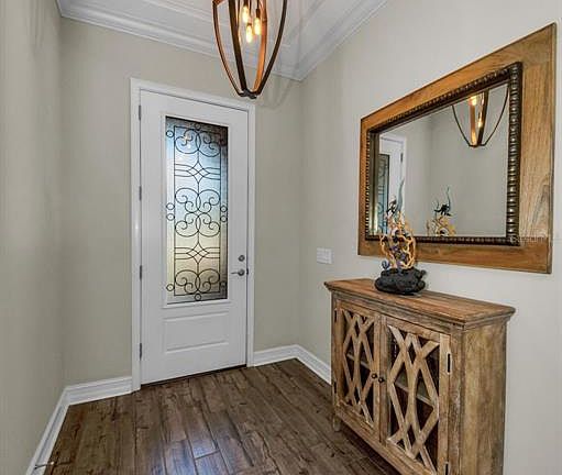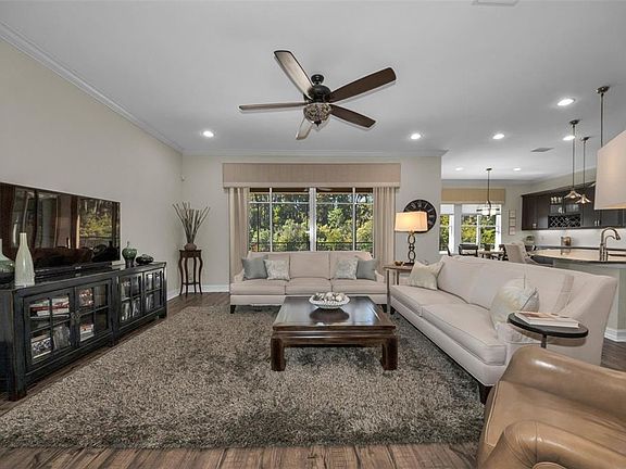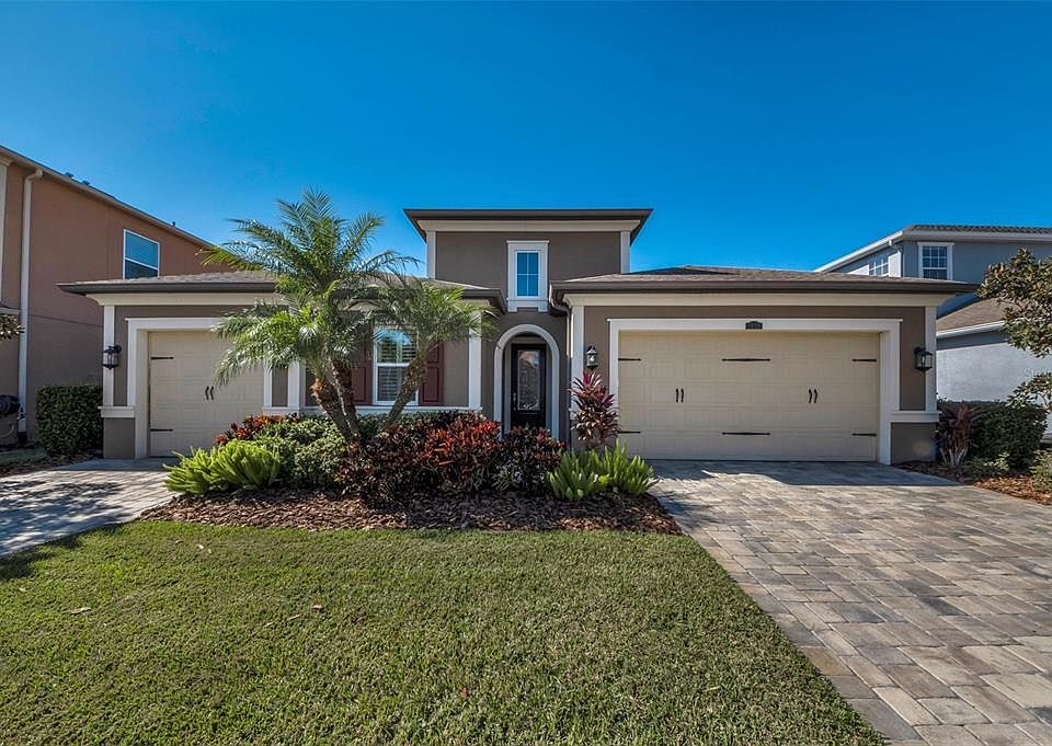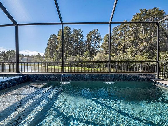 LUXURY POOL & SPA HOME WITH CONSERVATION & WATER VIEWS. A rare opportunity to own this impeccably designed 2016 CalAtlantic home in the highly sought-after GATED community in The Villages of Trinity Lakes (Sago Village). This elegant residence features 4 bedrooms (including 2 en-suites), 3 full baths, 2617 sq. ft. of living space, and a split 3-car garage. Upon entering, you’ll be greeted by 10-foot ceilings, 8-foot custom doorways, and coffered architectural details that set the tone for the home’s refined style. The great room and gourmet kitchen serve as the heart of the home, showcasing beautiful natural light and stunning views of the pool, pond, and conservation backdrop. The chef inspired kitchen is complete with plenty of custom cabinetry, granite counter tops, a half moon shaped center island with 3 pendant lights, stainless steel appliances, including double wall oven, cooktop and sleek canopy hood, walk-in pantry, reverse osmosis, recessed lighting, under the counter lighting with a spacious kitchen nook and sliders to the covered lanai and outdoor kitchen - perfect for entertaining your family and friends. The primary suite, ideally located at the rear of the home for privacy and offers tranquil views and a custom professionally designed walk-in closet. The spa-like primary bathroom boasts a garden tub, walk-in shower, dual vanities, linen closet and private commode closet. This split bedroom floor plan layout provides privacy for guests or family members, including a front located en-suite bedroom with the other two secondary bedrooms having easy access to the third bathroom. Step outside to your resort-style outdoor oasis, complete with a travertine pool deck featuring a custom outdoor kitchen, heated saltwater pool and spa with a serene waterfall feature. The rarely used custom kitchen comes complete with a built-in grill, refrigerator, sink and extra electrical. The designer touches and additional features you will see in this home include formal dining room with a coffered ceiling and crown molding, 8' doors, crown molding, plantation shutters, upgraded fixtures, tile floors in the common areas, separate inside laundry room with a laundry sink, washer, dryer, storage galore, sentricon system, keyless garage door access, gutters, water softener, reverse osmosis, reclaimed water for your irrigation, fenced-in backyard and more. NO CDD FEES, LOW HOA AND NO FLOOD INSURANCE REQUIRED! This HIGHLY SOUGHT AFTER TRINITY COMMUNITY HAS ACCESS to TOP RATED SCHOOLS. It is near golf courses, Starkey/Suncoast/Pinellas Trails, JW GILLS YMCA, shopping, restaurants, medical facilities, the Trinity Community Park that has a dog park, pickleball courts, and a walking trail around a beautiful pond displaying gorgeous sunsets. This home has easy access to Tampa International Airport, St. Pete/Clearwater International Airport, cultural centers, beaches and so much more. TRULY A MUST SEE.