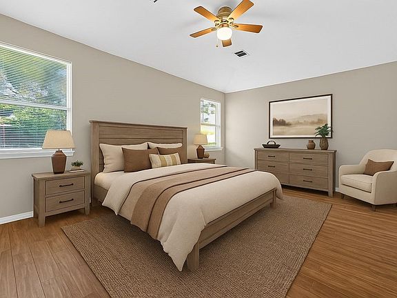 Step into this impeccably maintained home offering a seamless blend of comfort, style, and practicality. Rich wood-look flooring, vaulted ceilings, and ample natural light grace the spacious living areas. The open-concept layout includes a charming fireplace, elegant dining area, and a bright kitchen with white cabinetry, granite-look counters, subway tile backsplash, and stainless steel appliances. The tranquil primary suite features vaulted ceilings, a luxurious bath with dual vanities, mosaic tile accents, and a soaking tub. Additional bedrooms offer versatility with neutral tones and natural light. Outside, enjoy a private backyard with mature trees, lush lawn, and a paved patio—ideal for gatherings or relaxation. Community trails, lake views, and evening sunsets enhance the inviting lifestyle this home provides. A true sanctuary beckoning you home!