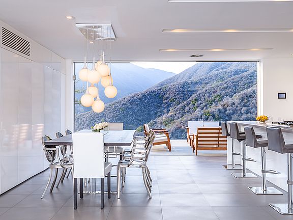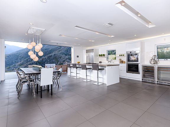 Sunset Mesa striking museum contemporary with sensational Santa Monica Mountain and Pacific Ocean views. Superb entertainer's open plan layout joins -via disappearing walls of glass- the interior living room (overlooking a private pebbled garden), shared fireplace, dining area and upscale Chef's kitchen (with Miele and Wolf stainless appliances and wine fridge), to the exterior split level entertainment deck, with a waterfall feature, outdoor fire-pit, and amazing infinity pool, all with the backdrop of extraordinary wilderness mountain/canyon views. Three generous bedrooms, each with tastefully appointed en suite bath and walk in closet. Master Suite has Queen's Necklace to Palos Verdes ocean views, and a portico between bedroom and bath. Mindful artistic touches, creative flair, and carefully chosen finishes throughout create a tranquil haven of modernity. Full laundry with sink & counter. Two car garage with enclosed storage cupboards.