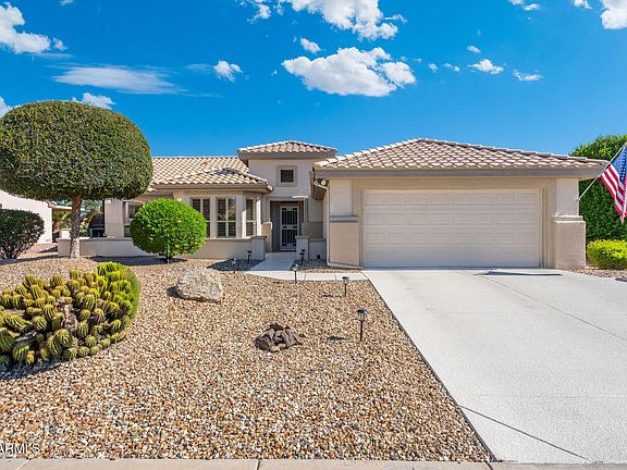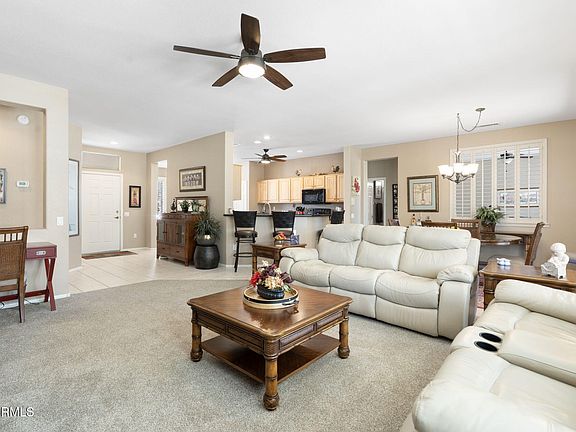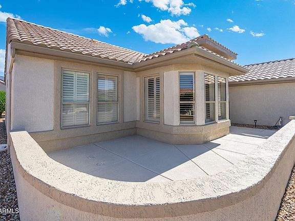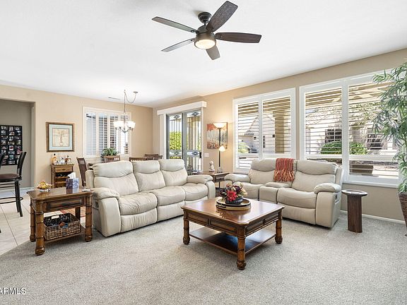 1870 sq ft Palo Verde Model 2 bedrooms and 2 baths with split bedrooms in Adult Community of Sun City Grand. Large private painted and sealed covered patio with knee wall. Perfect for entertaining family and friends. Eat-in kitchen has cabinets with lots of storage, granite counters, black appliance and pantry Large great room including dining area off kitchen. Large Master Bedroom with walk-in closet and double sinks in private adjoining bathroom. Second bath, spacious 2nd bed and large den/3rd bedroom are split from master. Tile in traffic areas, carpet, plantation shutters and neutral colors throughout. Painted and sealed front patio to enjoy AZ the evenings. Epoxied extended 2 car garage with built in cabinets, work bench Sealed driveway. Close to all the amenities of The Grand