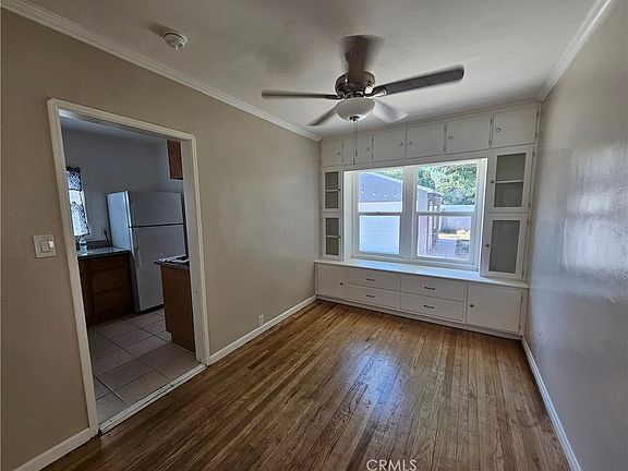 Bright sunny Updated mid century modern home with remodeled kitchen and bath, gleaming hardwood floors and newer stove, range hood , washer and dryer in inside laundry room. Fireplace in the living room, built in cabinets and window seat in the dining room built in closets and drawers in the bedrooms. 2 car detached garage, with long drieway, extra parking space in front and large block wall fenced back yard with huge shade tree. Light neutral interior ready for a new tenant.