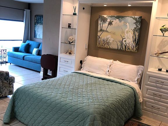 Penthouse Studio with amazing Gulf Views on one side and stunning Lagoon views on the other. These units rarely come available and offer limited private access to the 9th floor of the building. This is a one bedroom studio unit that has all you need for a fabulous get away! This studio has an open floor plan with custom built in cabinets storing a very comfortable Murphy bed. Tile flooring throughout and a fabulous living area overlooking the Gulf! The Gulf Shores Surf and Racquet offers 100 ft. of deeded beach access right across the street, a remarkable pool with inviting lush landscaping making you feel like you're in the tropics. Bring your boat! There is a launch, pier, boat slips (1st come 1st serve) and fish cleaning station. The tennis courts are awesome and then there's a hot tub after your work-out! Just an all around destination resort on the quiet side of the island with something for everyone!