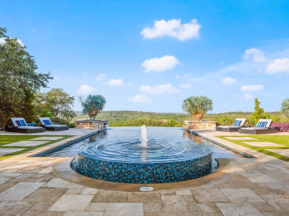 Stunning poolSpanish style villaLower level outdoor fireplaceHigh end finishesRefined finishesPrivate verandaSweeping hill country views