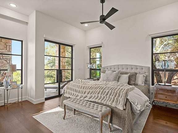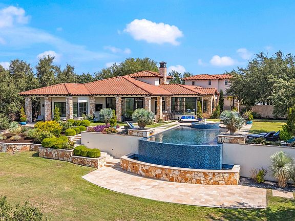 This captivating Spanish style villa, perched on the edge of the hill country with miles of vista views, offers both refined finishes and spectacular entertaining space. Boasting 3675 sq ft of indoor living space, an outdoor kitchen, an infinity edge heated pool and spa, and multi-level yard space living over 1.2 acres. This home is the perfect retreat that is still close to downtown Austin and the boating amenities of nearby Lake Travis. Throughout the home you’ll find the high end finishes such as a built in wine bar and espresso machine, Restoration Hardware chandeliers, a Presidio full wall door system, guest rooms and bathrooms that are tucked away for privacy. The primary bathroom offers the full spa experience with both a soaker tub and double rain shower heads, double vanities and two closets. In the primary bedroom, you can enjoy the sweeping hill country views from bed and your morning coffee on the private veranda. Up in the loft, you can easily have extra beds tucked away for guests, a private yoga sanctuary, or a sunny office area to work from. In the 4 car garage there is ample space for vehicles, a boat, and all of your adventure toys. Above the garage is a 400 sq ft flex storage space. A buyer could keep this as a storage space, or turn it into a nanny suite or teen hangout. By far, the crown jewel of this property is the stunning pool and entertaining spaces. This heated pool features a bubbling water feature, relaxing spa, cascading infinity edge that creates a fountain pool in the lower yard level, and brand new pump mechanicals. Your friends and family can join you at the outdoor kitchen while you cook up dinner on the grill. During the fall and winter months, you’ll enjoy utilizing the lower level outdoor fireplace. This home features multiple built in tech feature automations that control the blinds, HVAC, yard systems, and a Generac generator for protection from any grid outages.