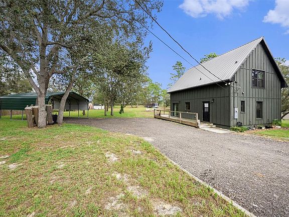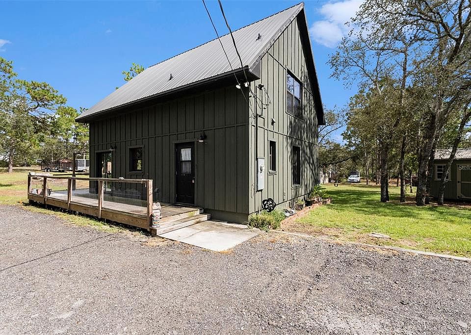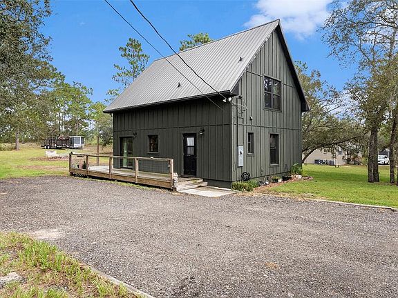 Nestled on just over 1 acre of land, this stunning, built in 2023, modern A-frame home offers a unique and charming living experience. With 1070 square feet of thoughtfully designed space, this home combines cozy comfort with contemporary style. Inside, the home welcomes you with high ceilings that create an open and airy ambiance. The 2 bedrooms provide comfortable retreats, while the full bathroom is complemented by the convenience of additional plumbing in place for a potential half bath. Main bedroom is downstairs and the second bedroom upstairs features 2 built-in beds. As you explore further, you'll discover the two double French doors that lead you outside onto the oversized wrap-around patio that extends 8ft off the back of the home. This patio is a perfect spot for outdoor relaxation, entertaining, and it allows for a seamless blend of indoor and outdoor living. Straight out the back, a fire pit awaits, providing the perfect setting for cozy evenings and gatherings with loved ones. The property also features 3 chicken coops, allowing you to embrace a self-sustainable lifestyle and enjoy fresh eggs straight from your backyard. Additionally, 10 established, raised, vegetable gardens await you; offering the opportunity to cultivate your own fresh organic produce. Within the garden area there is a hammock to sit back, relax and admire your hard work. There is also a man cave/she-shed on the property with electricity and a/c that you can use as an office, studio, or storage. Whether you're seeking a primary oasis with NO HOA or CDD, or flood zone, a homesteading haven or even an Airbnb investment opportunity, this property caters to your desires. Furthermore, it offers the convenience of being within proximity to shopping, dining, the Gulf of Mexico, and a short drive into Tampa. You’re close enough to the city but also far enough away from the hustle and bustle of daily city life. Don't miss the chance to experience the perfect blend of tranquility, modern living, and endless possibilities that this home and land offers. Also, something to note is pigeon racing is very popular in this area.