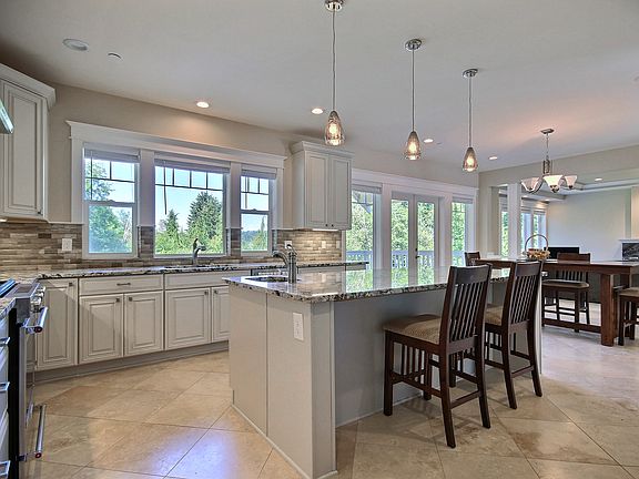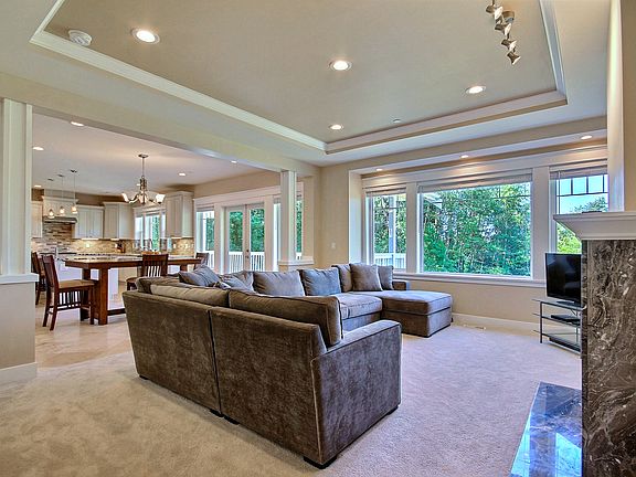 Masterfully designed home with luxury living on the main level; travertine tile, copenhagen granite counters, arrow black granite fireplaces, tray ceiling design and more. Covered deck with roof interior splendidly lined with wood; overlooking peaceful background of green space lined with trees. Meticulously incorporates areas for home business on lower level, spaciously designed 3 car garage, permitted accessory dwelling unit & potential AirBnB with parking on separate lower level area.