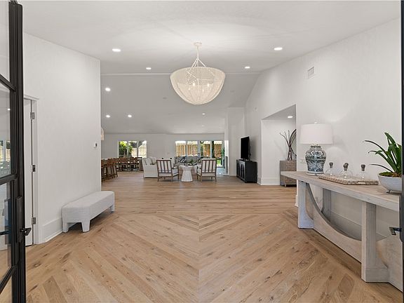 All four bathrooms have been fully renovated with top-tier fixtures and finishes, including marble flooring and tile, quartz and marble countertops, and double vanities. The primary bath is a sanctuary with an 8-foot walk-in shower featuring dual showerheads. The spacious bedrooms are bright and airy, with raised ceilings adorned with custom Cypress beams and closets fitted with custom shelving.