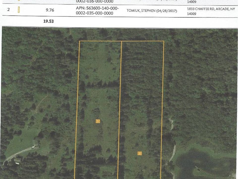 THIS IS AN ONLINE ONLY AUCTION THAT ENDS OCTOBER 22 AT 12 NOON!! 19.8 acres of wooded land with a nearly new 24'x24' concrete block garage with overhead doors. 600 feet of frontage in the middle of some of the best hunting area in New York State. 45 mins from downtown Buffalo. Open Oct. 15 and Oct. 18 at 3pm
