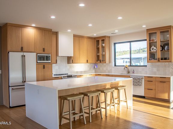 Set on 3.2 acres, the home itself blends modern craftsmanship with a character all its own. Inside, every room frames the landscape as part of the living experience. The kitchen is designed to impress and to serve — with quartz counters, custom white oak cabinetry, and high-end appliances. Bathrooms are finished with striking tile work that shows both intention and style. For those who need more than just a home, the property delivers: a 1,600 sf detached garage with 50A RV hookup, air-conditioned office, sink, and an additional 480 sf of covered space. There's even a detached sauna retreat complete with a half bath, changing room, and wood-burning stove a place to reset after a day in the desert.