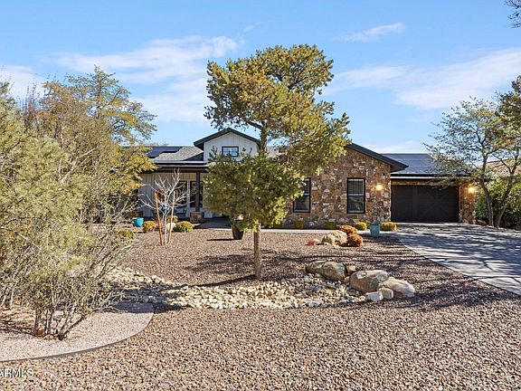 Discover luxury and nature in this stunning Enchanted Canyon home. This 3-bedroom + office, 2.5-bath retreat features an open great room with soaring ceilings and beautiful walnut wood floors. The gourmet kitchen boasts a spacious island, upgraded appliances, quartz countertops, and a farmhouse sink. The primary suite offers a spa-like bath with a freestanding soaker tub, a large walk-in closet, and quartz counters. Nestled among granite boulders and native Emery Oaks, this home enjoys San Francisco Peaks views, a hot tub oasis, and direct access to scenic trails and ancient petroglyphs. Upgrades include Anderson windows, porcelain tile baths, and a paver driveway. **Owned Solar System** With a level driveway and an oversized two-car garage, this is Prescott living at its finest!
