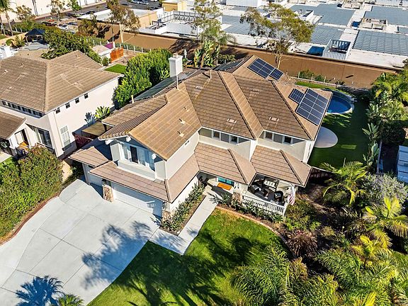 Tucked away on a quiet cul-de-sac just minutes from the beach, this stunning 5BR, 3BA single family home offers 2960 sq. ft. of beautifull living space along with a backyard oasis built for entertaining. Step inside and be greeted by soaring 18 ft. ceilings, abundant natural light from oversized windows and French doors leading to the back yard. The heart of the home is a spacious family kitchen with granite countertops, an island & all appliances. The adjacent family room has a cozy gas fireplace and sliding glass doors to the outdoors. The primary suite is a true retreat, featuring a private balcony, sitting nook, spa like bath & walk-in closet. Upstairs you will also find 3 additional bedrooms & a full bath in the hallway. The first floor en-suite 5th bedroom/bath has a large walk-in closet and is perfect for guests, a home office or multi-generational living. The back yard is a resort style paradise with quartz pool, infinity spa, fire pit, artificial turf and a lighted fully fenced setting designed for year-round enjoyment. Entertain in style under the Palapa, complete with built-in Bull BBQ, griddle, gas cooktop, sink, fridge and TV. set-up, perfect for hosting game nights or summer gatherings. Home has fully owned solar, & CAT 5 wiring throughout. The 3 car garage comes with a 50A Tesla charger, & epoxy flooring. Additional parking in driveway for up to 5 cars. Walking distance to the beach, minutes to downtown Oceanside and seamless access to I-5. No HOA, No Mello Roos. Call today to schedule a tour.