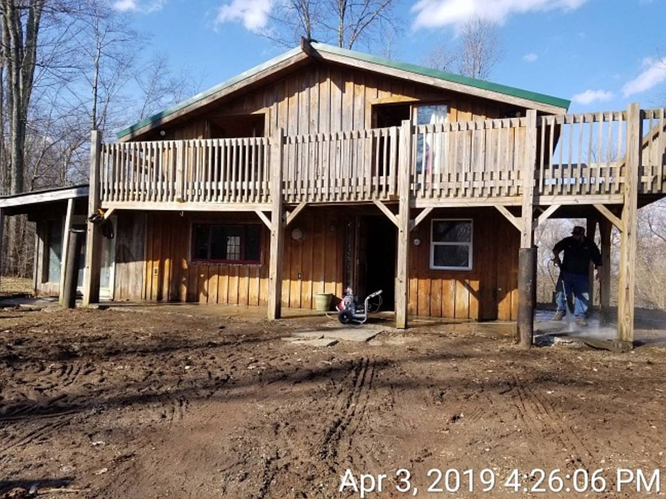 Private location, nestled in a 36+/-acre wooded lot. Rough cut lumber construction with full decks on front and rear second floor. Granite countertop in kitchen. This house has electricity and is also plumbed for gas lighting. Pond with adorable center island.