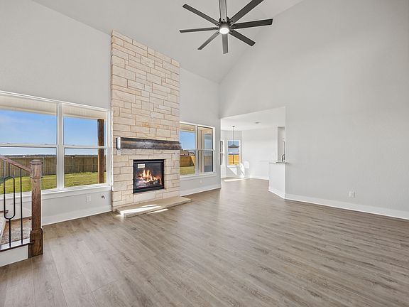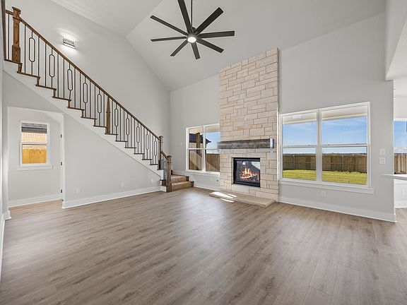 This stunning two-story home features a timeless stone exterior, black-framed windows, and a welcoming covered porch. Inside, an open and light-filled layout offers spacious living and dining areas perfect for entertaining. Large picture windows highlight the backyard and bring in abundant natural light. Upstairs, generously sized bedrooms and flexible space provide room for work, play, or relaxation. An oversized two-car garage adds extra storage and convenience. Located in a desirable neighborhood close to top schools, parks, and shopping, this move-in-ready home combines style, comfort, and quality craftsmanship.