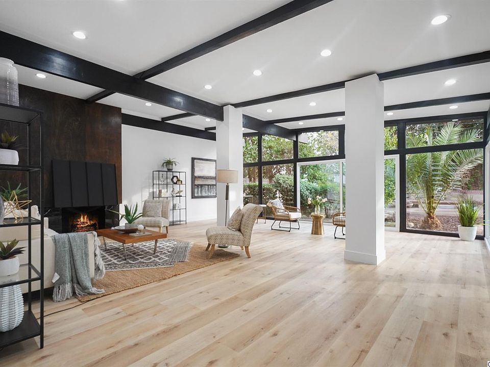 Welcome to this newly remodeled, most distinctive Mid Century Modern home in lovely Porter Ranch neighborhood! The beauty of this home lies in its unique architectural open floor layout. Once you walk into the home, the Modern Mid Century appeal acts as its main attraction with wall of glass bringing the indoors and outdoors together as one space, the magnificent vaulted ceiling with recessed lights throughout the entire structure. Once you step outside you will enter to a tropical oasis completed with a sparkling pool and off ground jacuzzi. Come and explore more about this piece of gem!