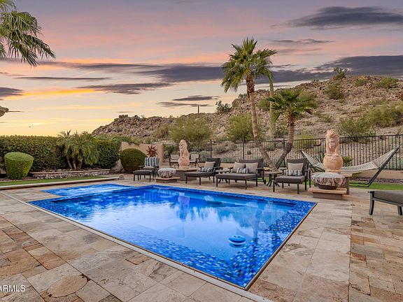 This exceptional luxury home, located in Estrella's exclusive Serenity neighborhood, offers unmatched amenities and one of the most breathtaking view lots you'll find anywhere! With prepaid solar and energy-efficient upgrades, this home truly stands out. The hillside backyard is a resort-style masterpiece, featuring an infinity-edge pool with spa, a custom pergola with outdoor kitchen and dining bar, multiple travertine-covered patio areas, and an elevated sitting space showcasing panoramic views of the Sonoran Desert Preserve and the majestic Estrella Mountains. Step inside to discover thoughtful design and luxurious comfort throughout. The owners spared no expense, adding countless upgrades for lasting enjoyment. The front exterior welcomes with a paver driveway, artistic inlaid walkway, lighted posts, raised planters, and a charming front porch. Inside, the elegant layout features a formal dining room, spacious great room, private study, and bedrooms connected by a Jack and Jill bath. The chef's kitchen impresses with distinctive cabinetry, granite counters, a large island, gas cooktop, butler's pantry with wet sink, and dual RO drinking systems.