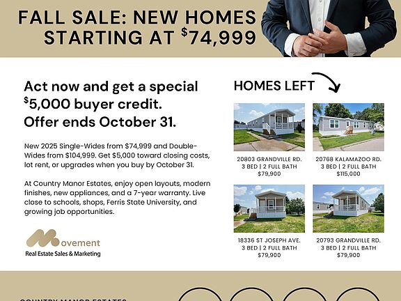 FALL SALE — ACT NOW! Get a $5,000 buyer credit on your new home in Country Manor Estates. Single-wides just $74,999 and double-wides only $104,999 — offer ends October 31st!