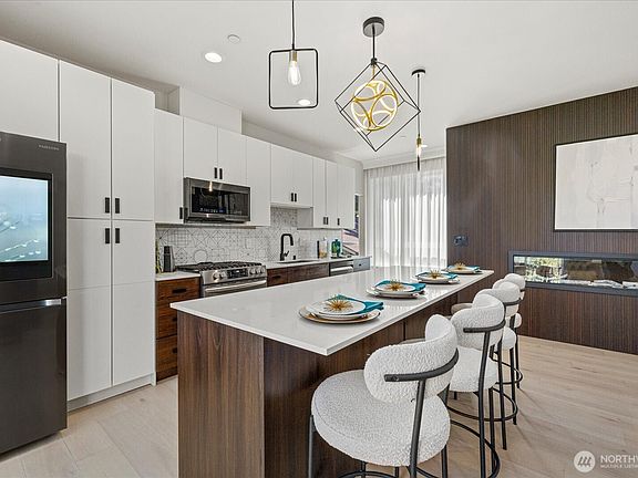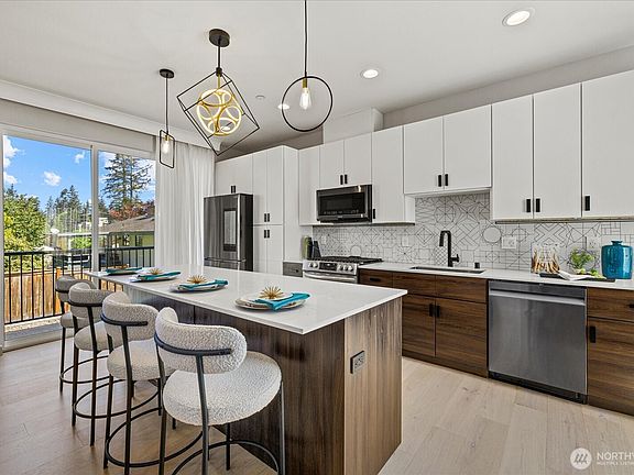 Stunning corner townhome set back off a quiet street. This open concept floorplan has been beautifully updated with designer finishes throughout. Chef’s kitchen displaying quartz countertops, stainless appliances and a generous island which blends seamlessly into the spacious living room. Four exceptionally sized bedrooms and four bathrooms including a primary with ensuite bath and walk-in closet. Rare two car garage with considerable storage space and EV charging. Located in the heart of Shoreline, less than a mile to the light rail and minutes from downtown Seattle.