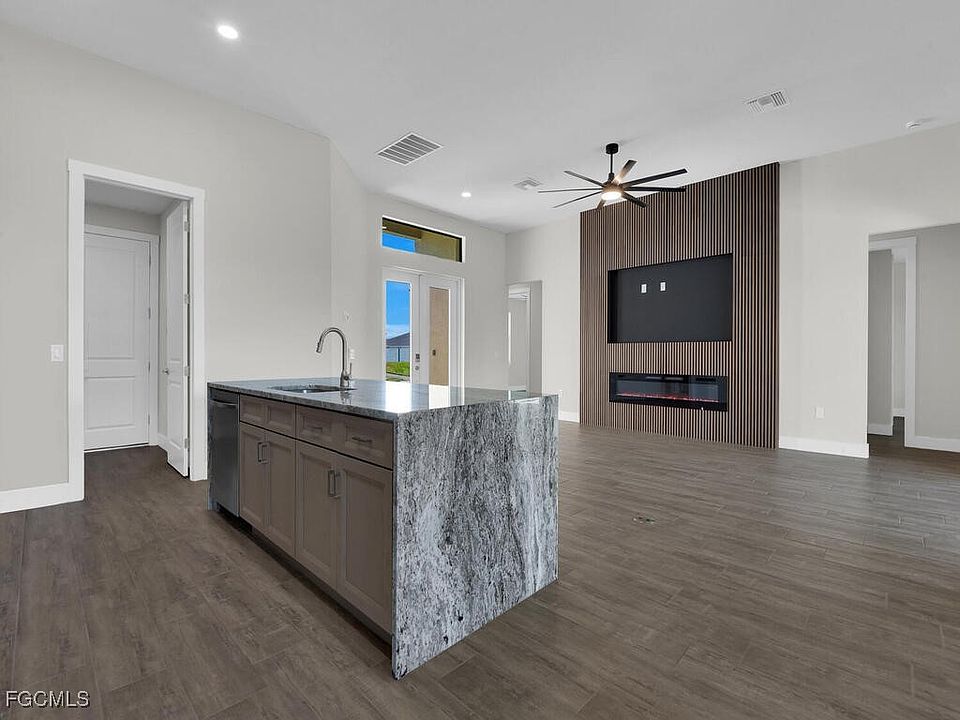 Discover the brand-new Custom Douglas Brooke Home on waterfront lot featuring 4 bedrooms, 2 bathrooms, and a 3-car garage, complete with impact-resistant windows and doors. Spanning over 2000 square feet, this home is adorned with high-end finishes. Step through the impact-resistant glass double doors and into a spacious great room showcasing elegant warm wood-look tile, accented electric fireplace and tv wall, soaring ceilings, and sliding doors that lead to an expansive pool area. The kitchen boasts oxford mist cabinets, granite waterfall countertops, and stainless-steel appliances. A large island separates the kitchen from the living space. Adjacent to the kitchen is a huge walk-in pantry and a sizable laundry room with a sink. The dining area, set behind the kitchen, features a vaulted ceiling. The master suite is a true retreat with walk-in closets and an ensuite bathroom with dual vanities and a walk-in glass shower. The home's guest wing offers three additional large bedrooms and a full bathroom. Completing this residence is a generous 3-car garage and a pool equipped with an alarm system. Additional features include in-wall pest control, pre-wiring for cable in the master and living rooms, smart home capabilities, and impact-rated windows and doors. Close to shopping, nightlife, boat ramps, hospitals, major airports and so much more! Rates as low as 3.99% for well qualified buyers with DBL Home Mortgage. 1834 NW 27TH Ave SITS ON FRESH WATER CANAL LOT. NO FLOOD ZONE. NO HOA FEES. 3-D video is of model home with same floorplan.