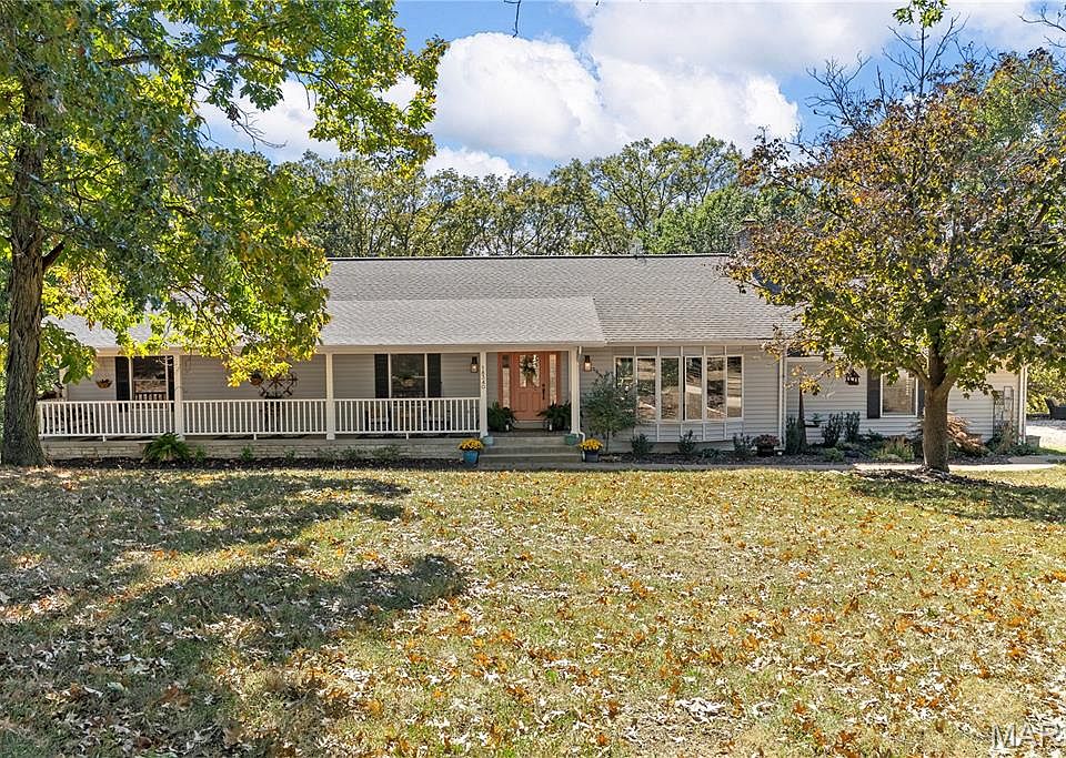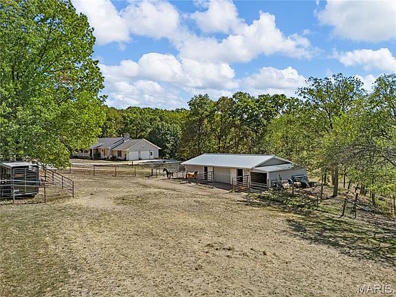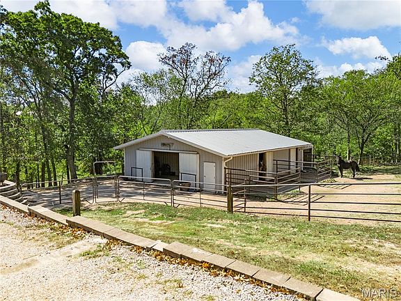 WOW LOOKING FOR THAT EQUESTRIAN PROPERTY THAT HAS IT ALL LOOK NO FURTHER! This is a one-of-a-kind EQUESTRIAN PROPERTY on private 9.79+/- acre lot in WILDWOOD w/CHARMING RANCH HOME, BARN & DRY LOT! 3,484+/- sqft, 3 bedroom, 3 full & 1 half bath home. Cozy covered front porch. Step down Living Rm features a warming floor-to-ceiling stone Wood burning FP, wood flooring, 14’ vaulted ceiling with wood beams, plantation shutters, & walk-out to deck w/spectacular views. Eat-in kitchen w/SS applis, tile counters & BS, & breakfast bar to Family Rm/Breakfast Rm that boasts wood flooring & walk-out to deck. Primary ensuite w/carpeting, large walk-in closet, plantation shutters, walk-out to deck & a bath boasting dual sink vanity, Jacuzzi, & separate shower. 2 Addtl bedrooms w/carpet, walk-in closets, & plantation shutters share hall bath. Laundry rm completes the ML. LL offers a rec room with a full bath, closet & walk-out to patio. Unfinished area. 58’ x 35’ Barn w/6 stalls, tack rm, electricity & water. Country living just mins to Wildwood, Greensfelder Park, I-44, & in AAA Rockwood School.