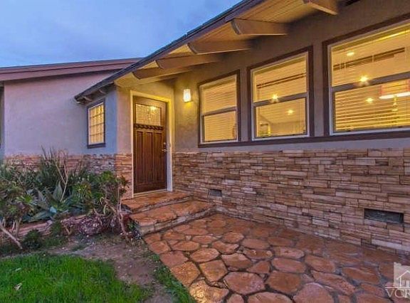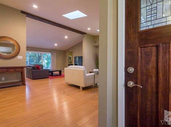 Stunning One of a kind, Porter Ranch pool home on huge 1/4 acre lot! With 4 bedroom and 2 baths this thoughtfully remodeled and updated home boasts a modern and open floor plan, granite counters, stainless steel appliances, designer paint and natural bamboo floors throughout. Vaulted ceilings with skylights allow lots of natural light to pour into this warm inviting home. Relax outdoors or dine al fresco on the covered patio that overlooks the huge backyard complete with fruit trees, large grassy area and sparkling pool.