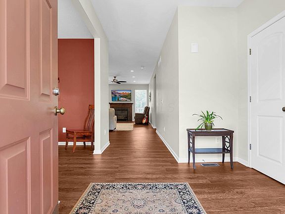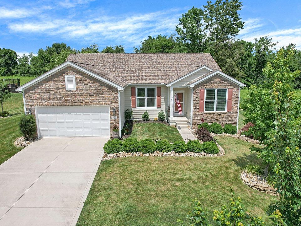 Step into this immaculately cared for charming ranch, built in 2017, in The Woods; nestled on a peaceful dead-end street. This home offers 3 comfortable bedrooms, including a luxury owner's suite, and 3 full baths. Experience bright, open living with 9-ft ceilings and oversized windows. Imagine relaxing or entertaining on your massive 40x20 deck with awning, overlooking a serene green field with mature trees. Cozy up by the gas fireplace or enjoy work-from-home ease in your private office. The finished basement offers a full bath, egress window, and endless possibilities. A security system, invisible dog fence and new sump pump provide peace of mind. This home truly feels like home!