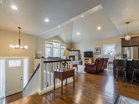 This stunning home built by Brian Murry Homes showcases the best of PNW architecture in desirable South Eugene. The property features beautiful hardwood floors, vaulted ceilings & large bedrooms. The owner suite includes a walk-in closet, soaking tub, & walk-in shower. Large living room, kitchen & upper deck are perfect for entertaining & relaxing. The lower level includes large family room, 4th bedroom and full bath. Situated on a private drive boasting views of nature & trees!