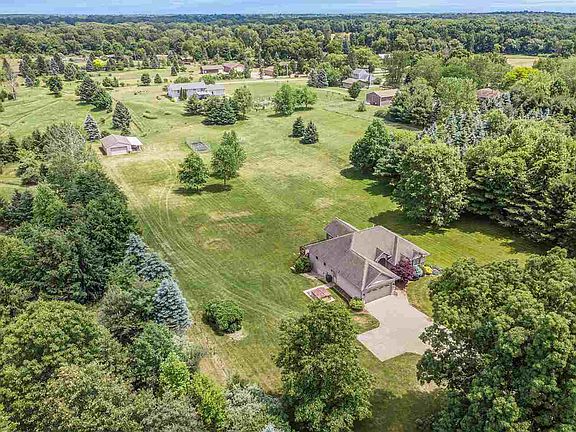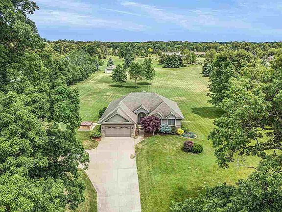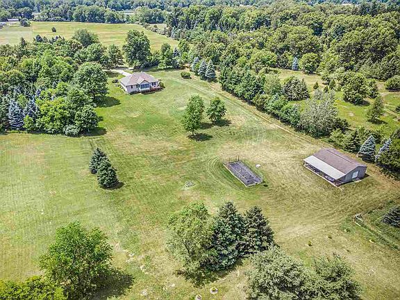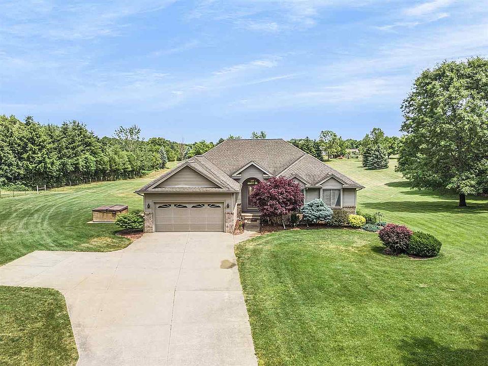 SPACIOUS & SPRAWLING CONTEMPORARY RANCH HOME ON 2.35+/- ACRES IN A DESIRABLE SETTING! Lush, gently rolling manicured lawns w/in-ground sprinklers & a concrete drive welcome you to the home of your dreams! Tremendous curb appeal & a grand entry of 10 ft ceilings will make you to fall in love! 4BDRMS/3BA featuring main floor living, an open floor plan, living rm w/walls of windows leading to a divine 3 seasons rm. Light filled dining area where you can step out onto the scenic backyard deck. Luxurious master suite w/trey ceilings, walk-in closet & private bath. Finished LL offers a 2nd kitchen, living rm w/fireplace, egress windows, 4th bdrm, 3rd bath & great storage space! THIS is the area for gatherings, holiday parties, in-laws suite & more! Updates include full house auto generator, Kinetico water softener, newer SS appliances, 50 yr shingles, hot tub & more. Washer & dryer included, less than 1 yr old. 24x30 Polebarn, concrete floor, electric & lean to. Near golf courses & lakes!