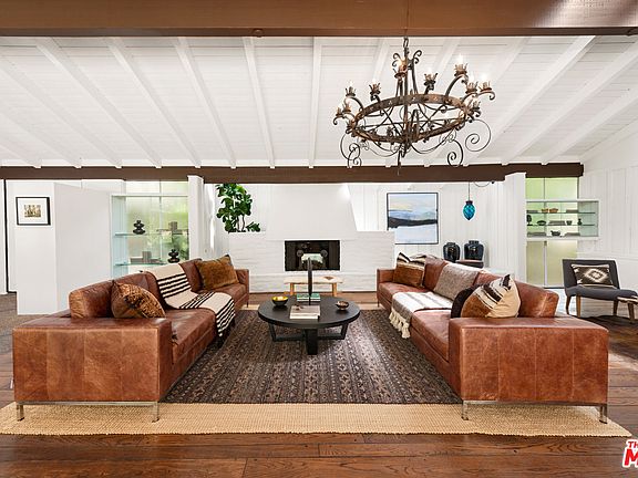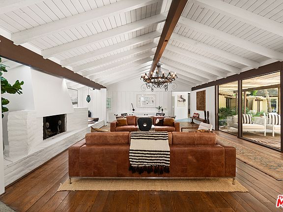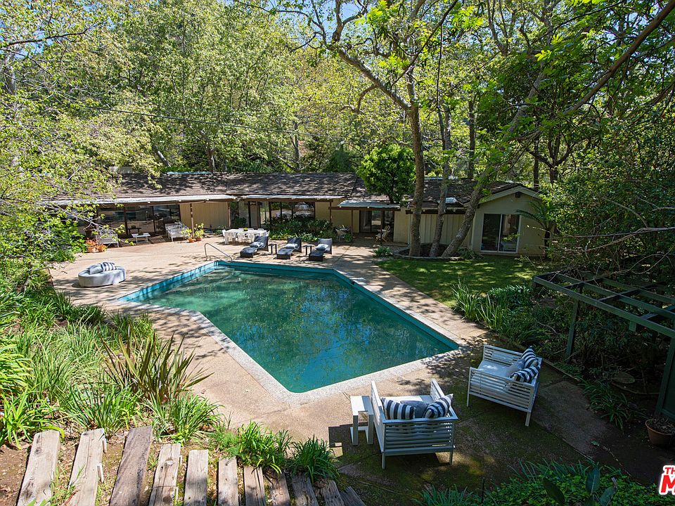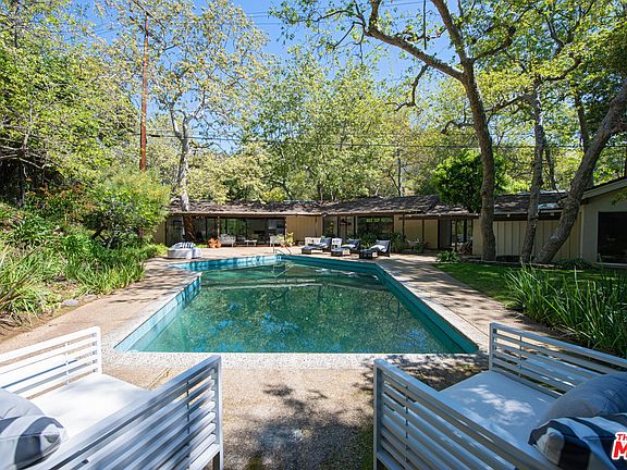 Designed by renowned architect Cliff May, this California ranch-style home has a bright, open interior that feels contemporary and welcoming. A wall of glass opens the living & dining area to a large patio, pool and park-like grounds of approximately .85 acres. Located in Brentwood's Sullivan Canyon and landscaped with mature trees, meandering paths and seating areas for dining and peaceful contemplation. Spacious great room has chandelier-height, wood-plank beamed ceilings, skylights, fireplace and hardwood floors. Bright kitchen features tile floors, garden windows and breakfast area overlooking yard. Home is in mostly original, well maintained condition. All three bedrooms enjoy the same tall beamed ceilings as the great room. The owner's suite has a sitting area and a large bath. This home suggests a casual lifestyle that incorporates the pleasures of moving easily between indoors & out.