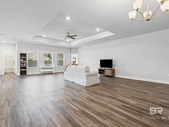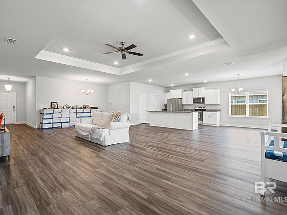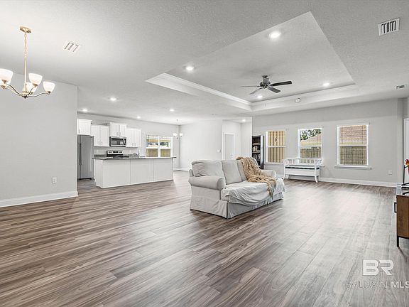 Welcome to this Gold Fortified 4-bedroom, 3-bath home offering an abundance of space in a thoughtfully designed layout. From the foyer, you’re welcomed into an expansive open plan where the living room, dining area, breakfast nook, and kitchen combine to create one of the largest gathering spaces you’ll find in this price point.The kitchen is both stylish and functional with granite countertops, white painted cabinetry, stainless steel appliances, an oversized island overlooking the living room, and a large walk-in pantry. This layout makes everyday living and entertaining effortless.The private primary suite features a trey ceiling, while the en-suite includes a garden tub, separate shower, dual vanities, granite counters, a large walk-in closet, and private water closet. Three additional bedrooms and two full baths provide versatility for guests, work-from-home, or hobbies.Inside, you’ll appreciate Mohawk enhanced vinyl plank flooring throughout—no carpet anywhere. Outside, a covered back porch extends the living space and overlooks the backyard.Other highlights include a 3-car garage, hurricane fabric shields, and this home is Gold Fortified. Located in a smaller, peaceful community while still just minutes from Highway 59, South Baldwin Regional Medical Center, shopping, dining, and the beautiful Gulf Coast beaches. Call today to view this spectacular home! Buyer to verify all information during due diligence Buyer to verify all information during due diligence.
