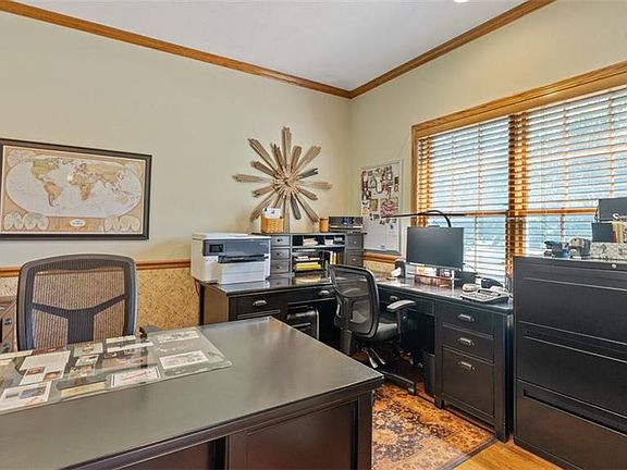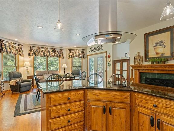 As you enter this remarkable residence, you are greeted by beautiful hardwood floors that seamlessly flow throughout the main level. The expansive layout offers an inviting formal dining area, perfect for entertaining, or a cozy sitting room enhanced by gorgeous views of nature. The main floor also features a grand living room accented by a custom bookcase flanking a warm fireplace, creating a perfect connection to the kitchen.