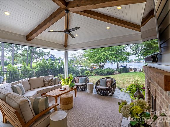 Outside, your private oasis awaits: a covered porch with fireplace and an electric retractable screen creates a year-round outdoor haven, ideal for al fresco dining or relaxing by the water’s edge. The private dock provides direct access for boating, fishing, or sunset cruises, with breathtaking lake views at every turn. The property is enveloped by extensive landscaping, featuring manicured gardens, mature trees, and a fenced yard for privacy and a safe space for pets or play.
