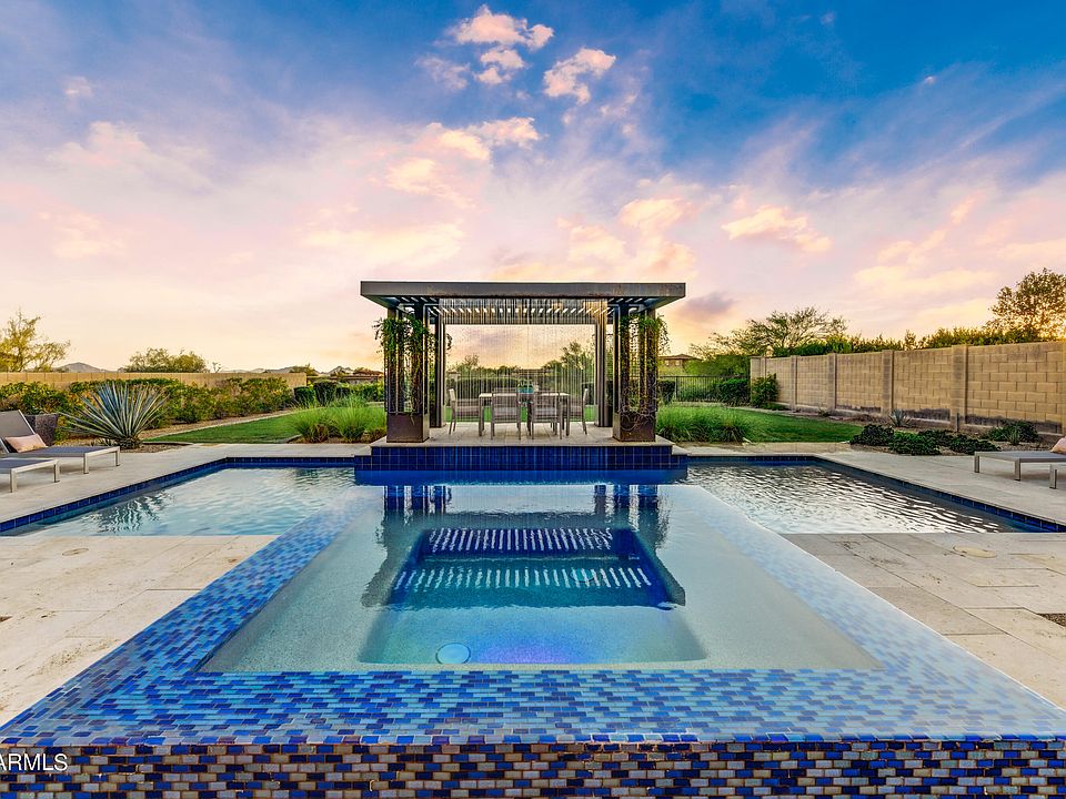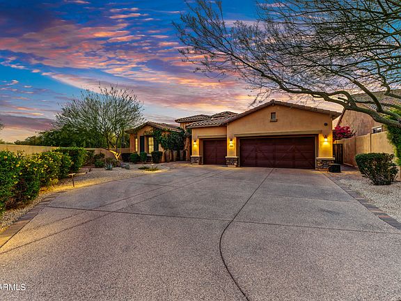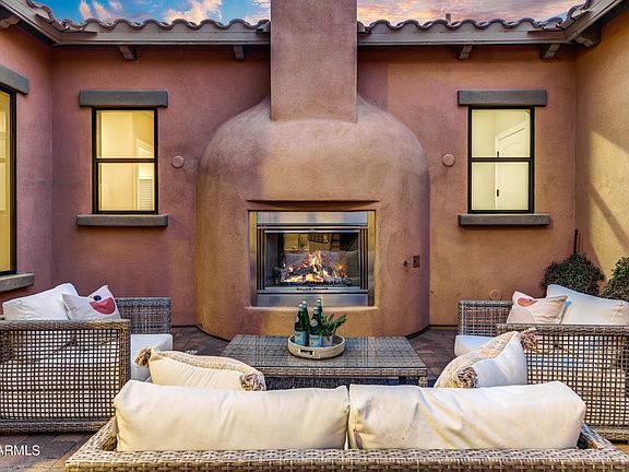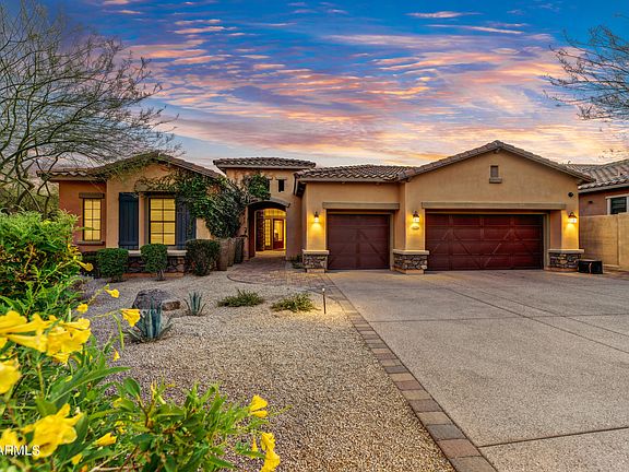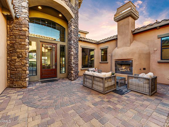 VIEWS, VIEWS, VIEWS! This expansive 4790 sqft home in the guard gated community of Windgate Ranch is perfectly positioned on a premium .38 acre private lot at the end of a cul-de-sac featuring 5 bedrooms, 4.5 bathrooms, and 3 car garage. Upon entering the outer gate, you'll be greeted by a 1 bedroom guest casita with en-suite bathroom and a charming courtyard with a cozy sitting area and gas fireplace. Once inside the main house, you'll be amazed by the scale of the foyer, with soaring ceilings of 20+ feet. The heart of the house is the enormous chef kitchen, outfitted with stainless steel appliances featuring double ovens, a 48'' range top, granite countertops, double islands, tons of cabinets, and a breakfast bar that opens onto the large great room with corner fireplace and a large multi-panel retractable glass sliding door. Additional interior features include a private den/media room opens onto the interior entry courtyard, a grand formal dining room, plus an informal dining area. The oversized primary suite is a great getaway, with a sitting area, and huge bathroom featuring double vanities, a separate soaking tub, walk-in shower, and closet. Upstairs, you will find a large bonus room with a large walkout deck that overlooks the backyard, the Sonoran Desert, with down valley views all the way to Camelback Mountain. This deck is also perfect for viewing weekend fireworks from nearby resorts. In the backyard, your own private paradise awaits where you will find a sparkling contemporary heated pool with an elevated spill over edge spa, a dining ramada with a rain curtain water feature, emphasized by the dramatic rain curtain, and a built-in gas bbq perfect for hosting guests or a quiet night at home. Windgate Ranch is at the base of the McDowell Mountains and features nearly six acres of green space throughout the community, walking trails, playgrounds, picnic ramada, tennis, pickleball, and basketball courts, sand volleyball, three pools and spas, poolside cabanas, an open-air living room, and is adjacent to the Gateway Trailhead, one of Scottsdale's BEST hikes. Call today for a private tour!