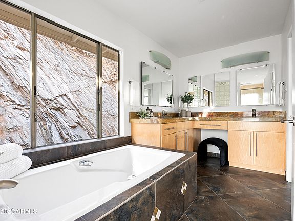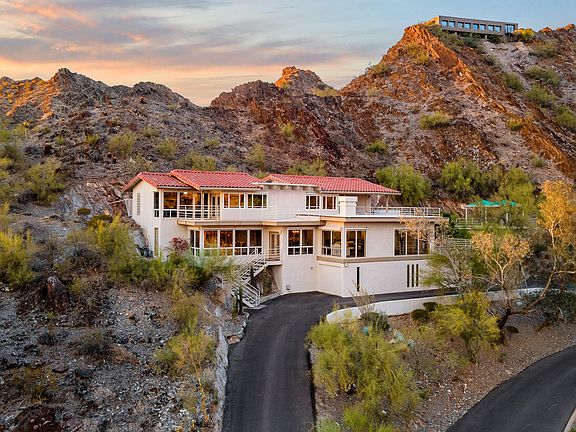 Perched in the hills of Cinnabar Canyon Estates, this striking multi level residence offers a rare blend of architectural interest & natural beauty. Designed to embrace the dramatic desert terrain, the home features soaring ceilings, walls of glass & sun-drenched interiors that blur the line between indoors & out. Multiple view decks capture sweeping views of city lights & rugged mountain silhouettes, offering a front-row seat to Arizona's most breathtaking moments. Blending mid century modern character with contemporary updates, the design feels timeless & intentional. Inside, warm wood flooring, custom built-ins & curated finishes elevate each space. The generous primary suite features a private view deck, walk-in closet & spa-like bath with a soaking tub set into the mountainside. Additional highlights include a spacious kitchen with granite countertops, multiple entertaining areas, a formal dining room, an office, and a hillside-diving pool surrounded by