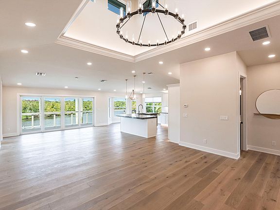Custom light fixturesWaterfront propertyCustom wood ceiling detailNeutral wood floorsLarge kitchenFurniture style bath vanities