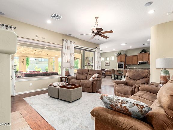 Welcome Home to Estrella Mountain Ranch - Where Comfort Meets Sustainability. Step into the lifestyle you've been dreaming of in this beautifully updated home nestled in the heart of the prestigious Estrella Mountain Ranch community. Designed with both comfort and conscience in mind, this home is a rare blend of elegant living and modern efficiency, perfect for the discerning buyer looking to elevate their everyday. From the moment you arrive, you'll feel the difference. Meticulously maintained and thoughtfully upgraded, this home features owned solar panels with battery, EV hook-up, new energy-efficient windows throughout, and new irrigation and water-saving landscape features giving you peace of mind, lower utility bills, and a more sustainable way to live. The professionally designed backyard is your personal oasis ideal for both intimate evenings and unforgettable gatherings. Enjoy the beautiful Carvestone patio with an extended covered patio and motorized retractable screens, custom outdoor cooking area, and a newer luxurious spa that invites relaxation under the desert stars. Every detail has been crafted to turn outdoor living into an experience. Inside, you'll find a space that lives as beautifully as it looks offering the perfect backdrop for family life, entertaining, and quiet moments alike. The many features include beautiful stained-glass doors, 10ft ceilings throughout, recessed lighting, solar tubes, attractive wood-look flooring, an inviting fireplace, and a stereo system with links to family room, owner's suite and patio. The eat-in kitchen comes with granite counters, staggered wood cabinetry with crown molding, built-in appliances including newer double oven, walk-in pantry, and a large island with a breakfast bar. And all of this, in a community known for its lakes, trails, mountain views, and resort-style amenities.