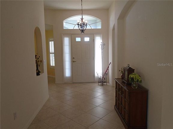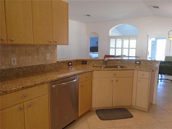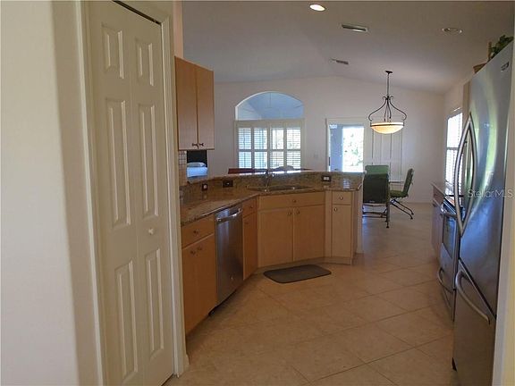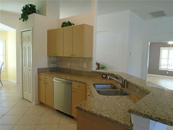 Absolutely move right in! As you enter into the foyer you have soaring lace ceilings & 18" tile flooring throughout and set on a diagonal pattern. The kitchen has light cabinet w/granite counters, tile backsplash, stainless steel appliances, closet pantry, breakfast bar and a wonderful breakfast nook area w/plantation shutters. The kitchen overlooks the living & dining rooms so you'll always be with your guests when you are entertaining. The guest bedroom has ceiling fan & plantation shutters. The guest bath has granite counter, linen closet and tub w/shower. Double pocket doors lead you into the 3rd bedroom which is being used as a den w/ceiling fan & plantation shutter. The master bedroom has plenty of room for all your pieces and two walk in closets. The master bath has updated vanity w/granite counters w/dual sinks and a walk in shower. The laundry room has front load washer & dryer and the garage has a utility sink. Just off the dining & living rooms is the lanai that you and your guests will enjoy the tranquil view of the pond! This home is light & bright, neutral in color to go w/anyone's décor! This gated offers golf, tennis, htd pool & spa, fitness center, pavilion w/picnic tables & grills, bocce, shuffleboard, horseshoes, game & computer rooms, art & craft rooms, lounge & restaurant plus dance hall. There are many events & activities that your social calendar will always be full! Close by to area restaurants & shopping.
