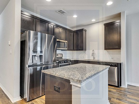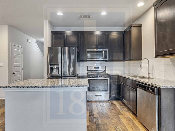 Don't miss this gorgeous home in Leander! This gem features an open layout with stainless steel appliances in the kitchen, refrigerator, washer, & dryer included! NO CARPET, all hardwood and tile flooring throughout, ceiling fans throughout, balcony access, solar panels, xeriscaped backyard - artificial turf, and built-in catio at back of house! Primary bedroom with ensuite complete with extended vanity sink, standing shower, and walk in closet! Rear patio in the backyard perfect to relax or entertain, garage is detached with private backyard entrance and alley access. Enjoy the community pool, greenbelt and city park located down the street!
