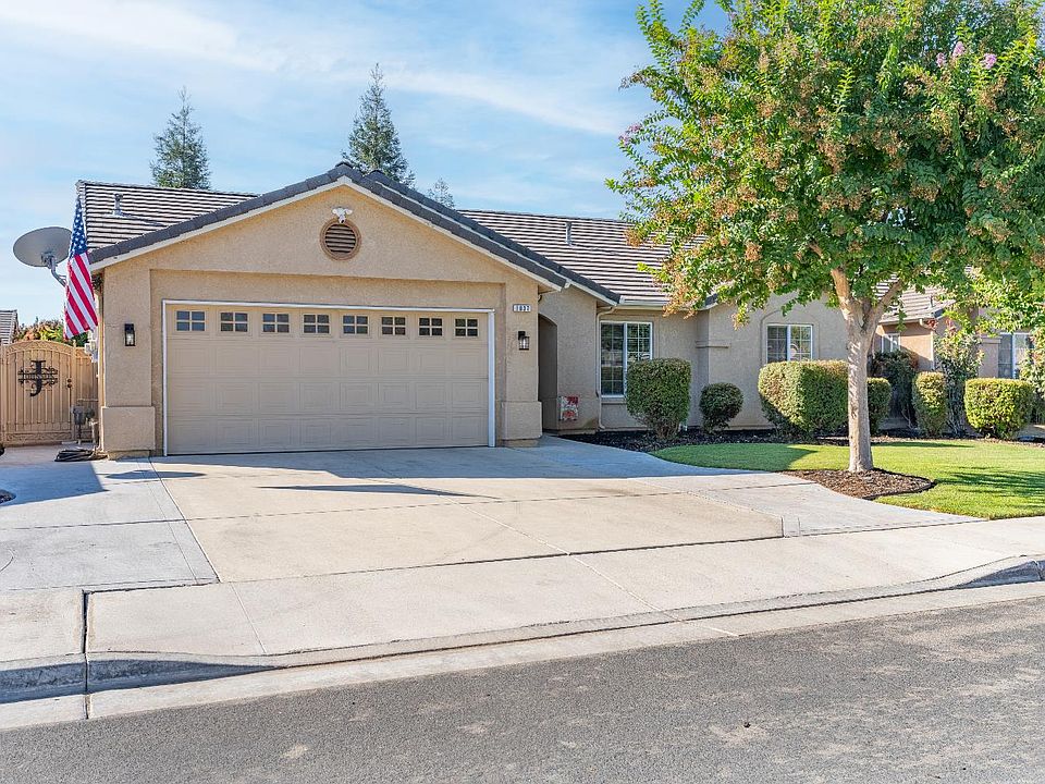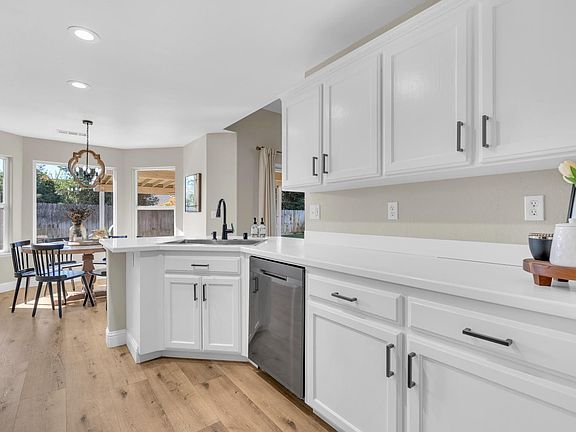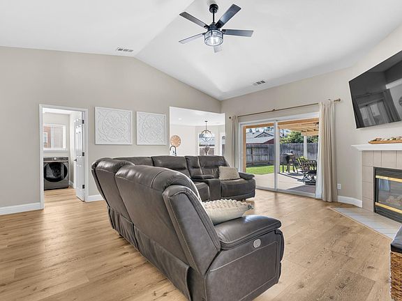 Welcome to your beautifully updated Sanger home! This charming 3-bedroom, 2-bath residence offers all the right upgrades and a modern farmhouse vibe. As you arrive, you'll notice the spacious concrete driveway, iron side gate, and well-maintained landscaping that create great curb appeal.Inside, you'll find new LVP flooring and baseboards throughout, adding warmth and style. The inviting living room features vaulted ceilings, a cozy gas fireplace, and a remote-controlled ceiling fan. The bright, modern kitchen showcases white cabinetry with new hardware, LED lighting, stainless steel appliances, and a gas range perfect for home chefs. Enjoy meals in the kitchen nook under farmhouse lighting with a large window overlooking the backyard.The primary suite offers generous space, high ceilings, and a newer ceiling fan, while the ensuite bath includes updated mirrors, fixtures, and hardware. The hall bath has also been refreshed with modern touches and white cabinetry.Step outside to a spacious backyard designed for entertaining, featuring a large covered patio with two ceiling fans and plenty of room for gatherings. Solar panels are conveniently located on the patio side of the home for energy efficiency.