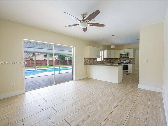 Spacious 4/2 rental in Gerardmere Acres! Features a cozy living room w/laminate floors, decorative fireplace, and recessed lighting. Large family room opens to pool & patio. Kitchen offers stone countertops, eat-at counter, pantry, SS appliances, & double sink. Tile dining room, 1-car garage w/W&D, storage, and A/C handler. Master suite with walk-in closet, private bath, and sliding doors to patio. Three additional bedrooms with laminate floors, fans/lights, and closets. Guest bath w/double sinks, shower, patio access. Screened patio, summer kitchen, pool w/cool decking, fully fenced yard, carport, fruit trees, alarm-ready, electric gate, no HOA, and new roof!